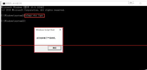2、在弹出的窗口中输入slmgr.vbs /upk,并按回车,过会会提示”已成功卸载了产品密钥“。