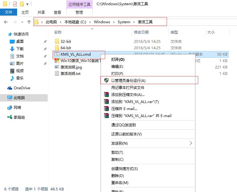然后打开复制到c盘的这个“激活工具”文件夹,具体路径是,”C:\Windows\system\激活工具\“ 如图,然后点击 右键管理员执行KMS_VL_ALL,接下来就是激活过程,大概1分钟内就可以完成,根据你电脑的配置决定。