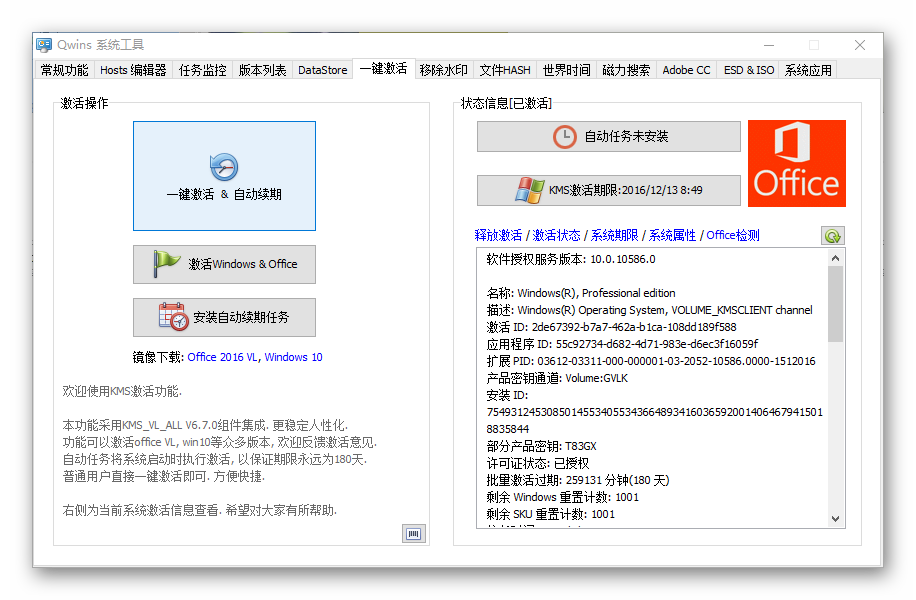 Qwins 系统工具,强大实用的Win10小工具,集成移除水印、一键激活系统、Office、KMS续期、ESD转换、磁力搜索、文件HASH、系统信息、系统版本、系统应用、Hosts编辑、Adobe CC激活等诸多功能。
