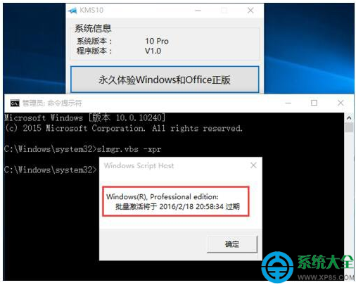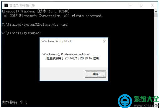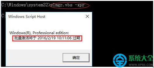 6、查看是否永久激活,输入slmgr.vbs -xpr命令,会弹出提示窗口,提示“批量激活将于。。。到期”,到期过后还要继续激活。