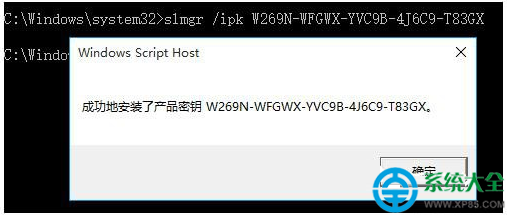 3、然后,如果是专业版用户请输入slmgr /ipk W269N-WFGWX-YVC9B-4J6C9-T83GX命令,如果是企业版用户请输入slmgr /ipk NPPR9-FWDCX-D2C8J-H872K-2YT43命令。然后会弹出窗口提示“成功的安装了产品密钥”。