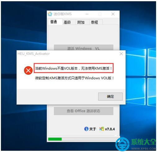 双击打开“HEU_KMS_Activator_v7.8.4.exe”,在显示的主界面中点击“激活windows VL”,即可激活。可是在我这里却出现了当前Windows不是VOL版本,估计我这镜像是在MSDN上下载的专业版不是VOL(团体批量许可证),企业版应该支持,如果是企业版的系统可以试试。