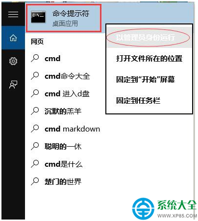 1、首先,要用管理员权限打开cmd命令行窗口,可以搜索框中输入“cmd”,在出现的“命令行提示符”,图标上右击“以管理员身份运行”。