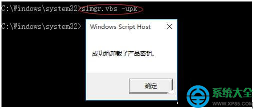 2、为了让其它激活工具的密钥清除,先卸载密钥,在命令行输入slmgr.vbs -upk,然后会弹出窗口提示“已成功卸载了产品密钥”。