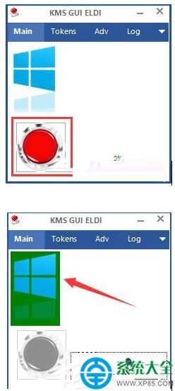5、在出现额程序主界面中,点击左下角的”红色大按钮“,等待一会儿,你会发现左上角的win图标背景变成了绿色。此时激活就成功了。