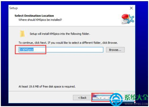 3、选择安装目录,建议安装在C盘以外。在这里我安装到D:\KMSpico目录中,然后点击”Next“。