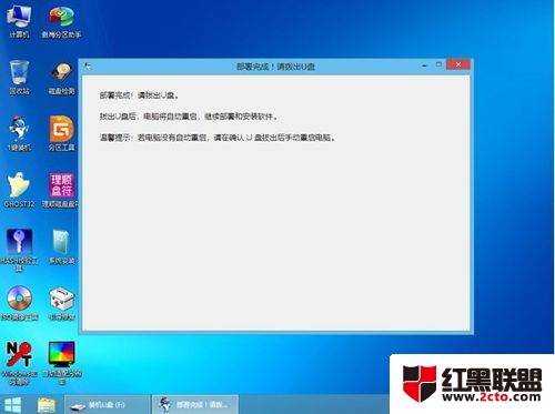 1、还原完成,按提示拔出U盘,拔出U盘后电脑将自动重启,安装系统(系统安装过程中,请勿进行任何操作),直到进入win10系统为止;