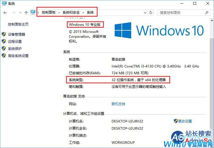 打开“控制面板”,依次进入“系统和安全”-“系统”界面,从中就可以查看到当前系统的版本号以及位数,如图所示。