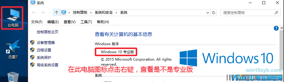 2、其它版本win10系统,小编没有测试,在Windows10专业版测试成功,我们可以在此电脑图标上点击右键,打开属性,查看自己win10系统版本。