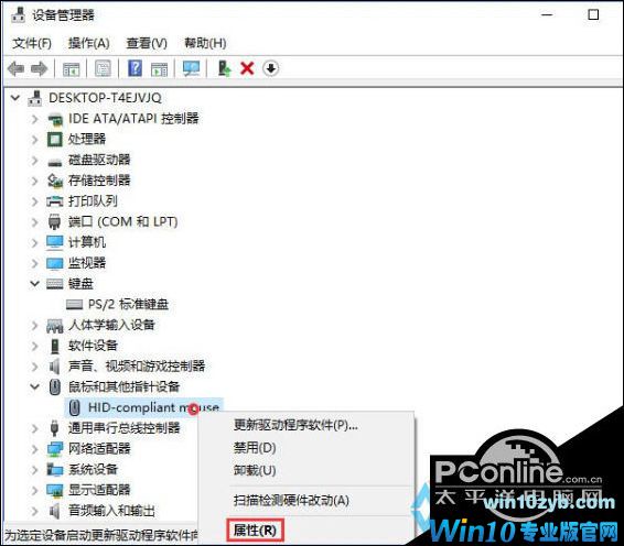 4、接着,在设备管理器中展开【鼠标和其他指针设备】,在下面我们可以看到【HID-compliant mouse】,在该设备上单击右键,在弹出的菜单中点击【属性】