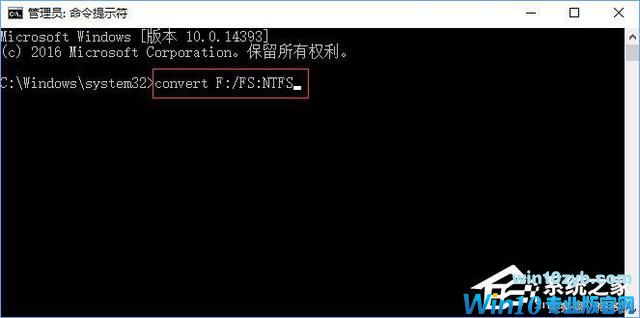 2、在命令提示符中输入:convert F:/FS:NTFS 按下回车键,耐心等待转换磁盘格式;