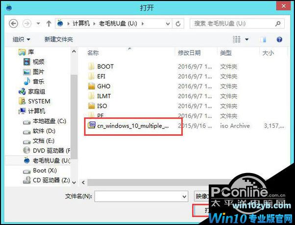 3、此时会弹出一个查找范围窗口,我们只需打开U盘,选中Win10 ISO系统镜像文件,点击“打开”按钮,如下图所示: