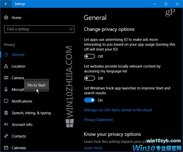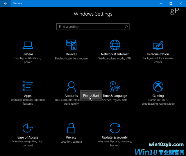 现在,您可以通过各种设置进行浏览。 右键单击所需的,然后单击“固定到开始”。 对于每个人,系统会提示您验证是否要采取行动。