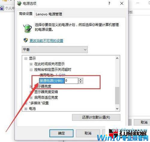 但我们将其改为0分钟之后,意味着系统将不再会在锁屏之后关闭显示器(接通电源时),如果你还想让其自动关闭显示器,可以调整时间,然后将时间改的稍微长一点儿即可,小伙伴们赶快试试吧。