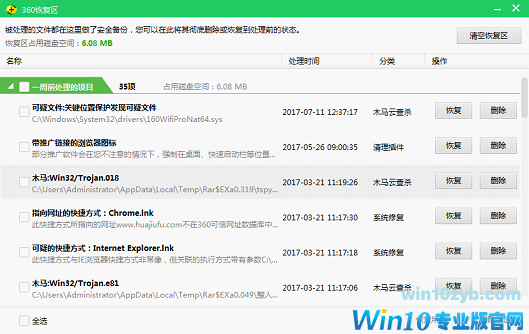 有时候杀毒软件也互抽风误报病毒,并疑似携带病毒的文件给删掉。以360杀毒软件为例,你可以在“360恢复区”里查看到近期被隔离的文件,如果确认是可信任的,直接点击“恢复”即可。