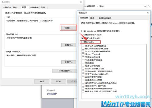 然后请在“性能”处点击“设置”功能按钮,在弹出的复选对话框中,将一些不必要的应用效果取消掉。如下图所示:
