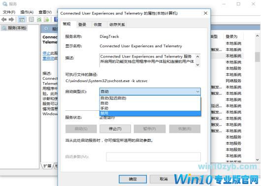 2、然后请双击Connected User Experiences and Telemetry服务进程,在“启动类型”处选择“禁用”,再按下“停止”功能按钮。