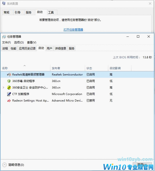 2、然后请在“系统配置”对话框中,依次点击“启动项——任务管理器”,再将一些不必要的应用状态设置为“禁用”。
