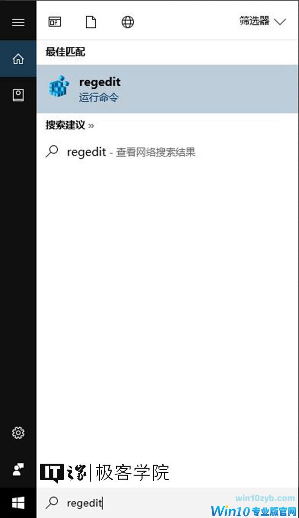 以Administrator账户登录Win10后,在微软小娜中搜索并打开regedit。