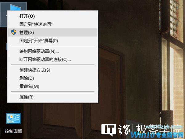 首先,将鼠标光标放在“此电脑”图标上,点击右键,再点击管理。