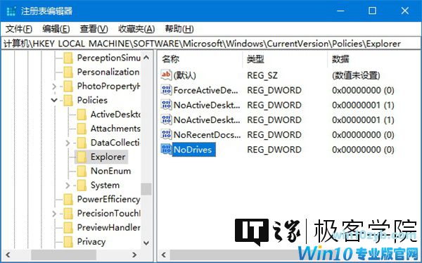 找到名为NoDrives的DWORD(32位)值,双击该值,将其数值数据改为0,然后重启即可。