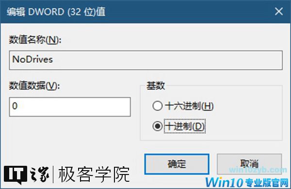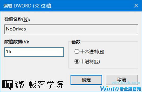双击我们刚刚新建的名为NoDrives的DWOED(32位)值,将该值基数改为10进制,再将该值的数值数据设置为16。