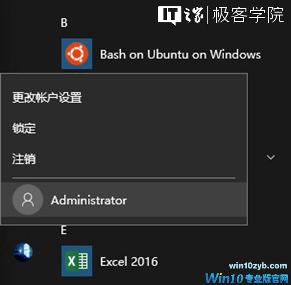 这时,点击开始按钮,再点击你的头像,你可以看到Administrator项,只要点击它,我们就可以以Administrator帐户登录Win10了。