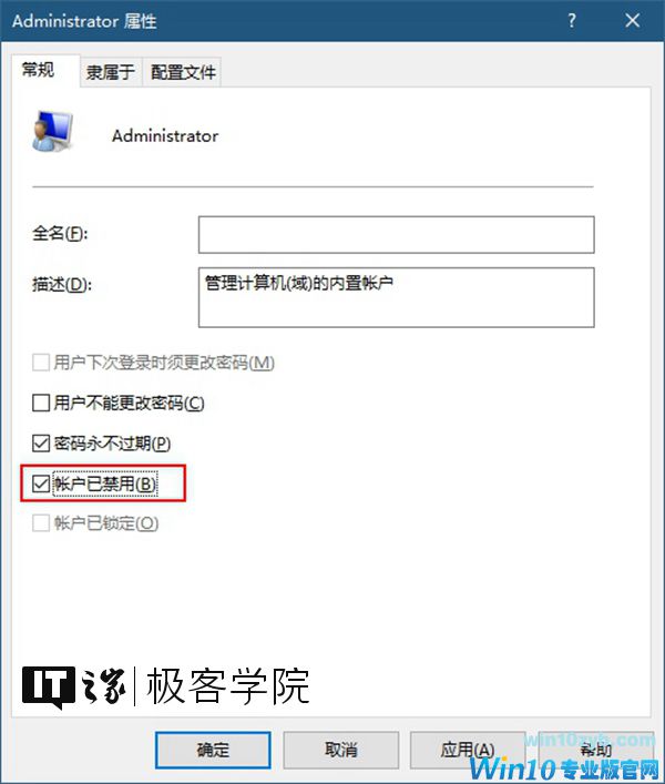 双击帐户列表中的Administrator项,将账户已禁用项取消勾选,然后点击确定按钮。