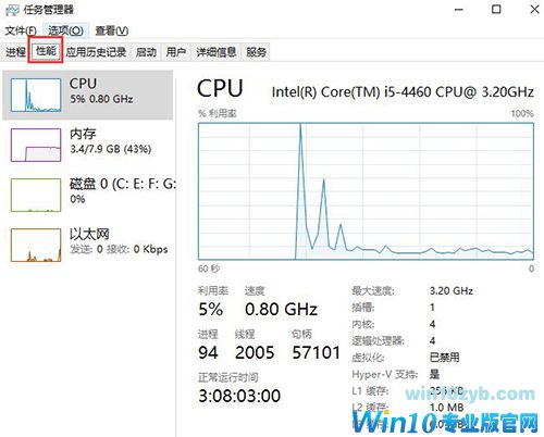 点击性能就可以看到电脑的CPU利用率,还能看到内存以及磁盘占用情况。