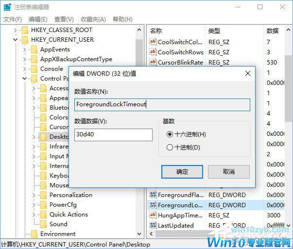 3、在右边双击"ForegroundLockTimeout",把这个数值改成10进制的任何6位数以上(系统默认200000毫秒/十六进制30d40),如果没有,请新建一个 Dword 32位值 然后命名为 ForegroundLockTimeout 即可!