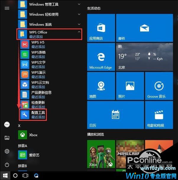 1、点击开始菜单,找到WPS Office,选中WPS Office中的配置工具,如图: