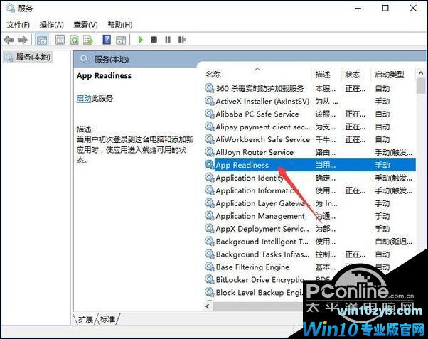 2、在服务列表找到App Readiness服务,从描述中可以看到该服务与用户登录有关。双击该服务项,打开属性窗口,首先停止该服务,然后把启动类型设置为“禁用”,如图: