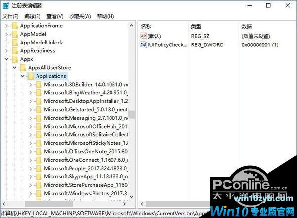 5、在注册表中依次展开:HKEY_LOCAL_MACHINE\SOFTWARE\Microsoft\Windows\CurrentVersion\Appx\AppxAllUserStore\Applications