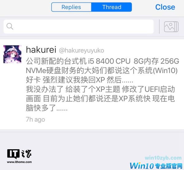 其表示,通过为系统安装了XP主题、修改了UEFI启动画面,公司大妈表示“还是XP系统快”、“现在电脑快多了”,成功解决问题——尽管方式有点不对劲。。