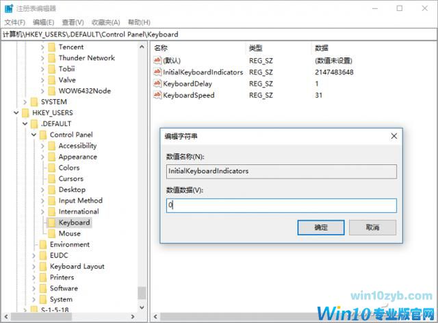 双击右侧的"InitialKeyboardIndicators",把它的数值数据修改成"0",注销当前用户或重启电脑就OK了。
