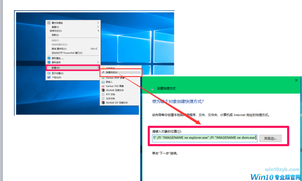 1、右键系统桌面空白的地方,选择新建→快捷方式,在打开的创建快捷方式窗口的输入:taskkill /F /FI "USERNAME eq xyz75" /FI "IMAGENAME ne explorer.exe" /FI "IMAGENAME ne dwm.exe"命令,然后点击“下一步”。(代码建议直接复制,以免出现差错)。