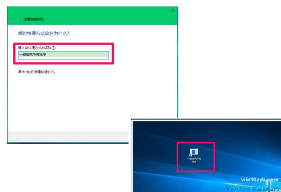2、然后将快捷方式窗口的名字命名为例如:一键结束,然后点击完成按钮,然后在桌面上就可以看到它的存在了,如果电脑在卡死的现象时左键双击它,这样就解决了电脑卡死的问题了。