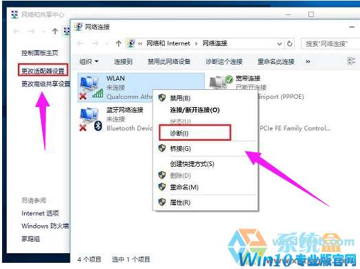 点击左侧的“更改适配器设置”,之后会进入网络连接设置界面,然后找到“WLAN无线网络”,然后在其图标上鼠标右键,在弹出的菜单中,点击“诊断”