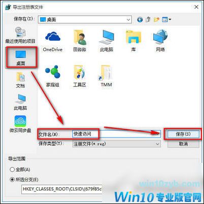 2、在打开的导出注册表文件窗口,检查注册表路径是否正确(最下面的所选分支),再点击:桌面,在文件名(N)栏输入:快速访问,点击:保存;