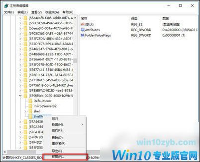 4、我们备份了{679f85cb-0220-4080-b29b-5540cc05aab6}\ShellFolder的注册表键值,现在再来修改ShellFolder的权限值(不修改ShellFolder的权限值,则无法修改Attributes的键值),右键点击ShellFolder,在右键菜单中点击:权限;