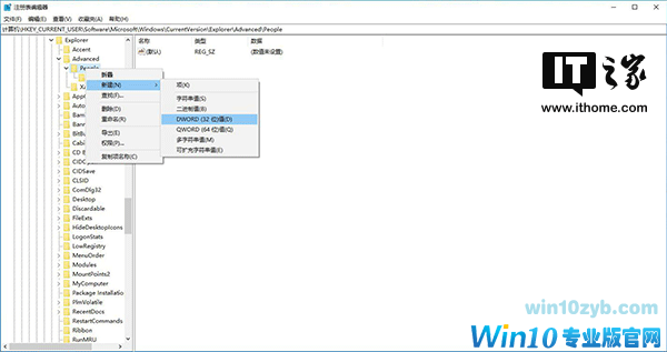 右键点击“People”文件夹,选择新建,DWORD(32位)值。将新建的文件命名为“TaskbarCapacity”,双击该文件,将“数值数据”设置为“10”,点击确定之后重启电脑即可。