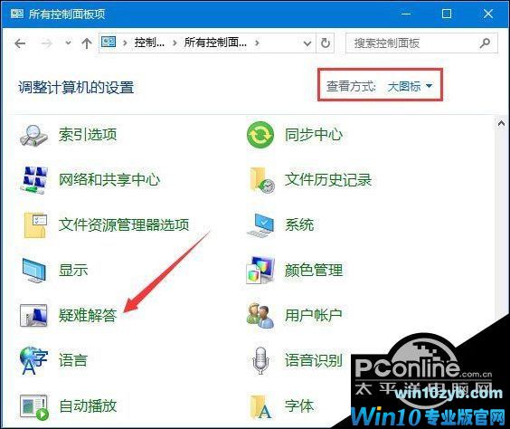 2、在控制面板中将查看方式修改为大图标或小图标,点击打开【疑难解答】;