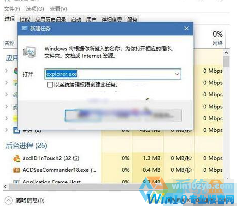 第三步、在弹出的新建任务输入框中,输入explorer.exe后,按回车键或者点击确定按钮(重启文件资源管理器),执行此运行命令即可。
