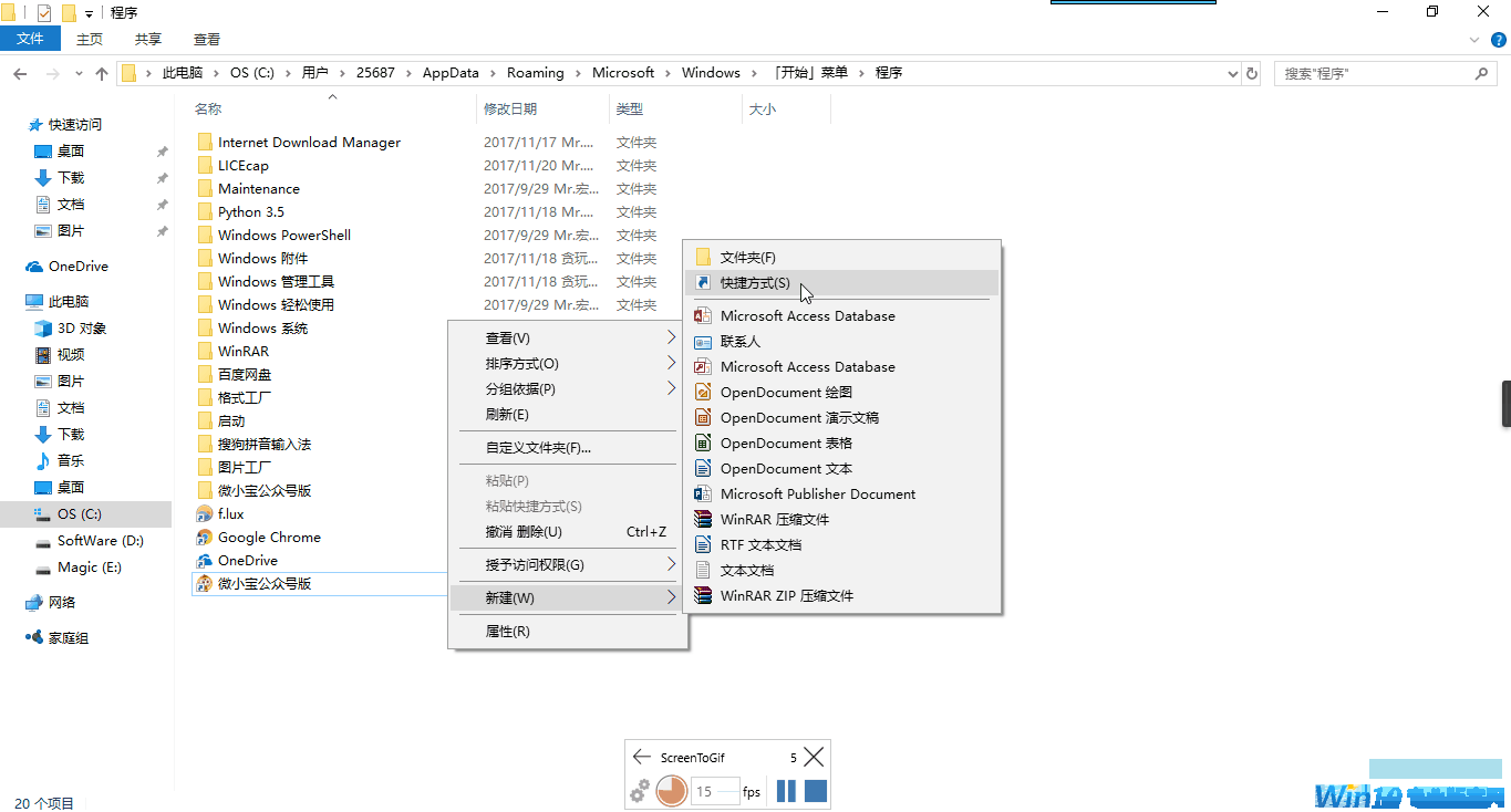 定位到C:\Users\(用户名)\AppData\Roaming\Microsoft\Windows\Start Menu\Programs,如果是一个一个文件夹的打开,需要先开启"查看隐藏项目"。具体如下图: