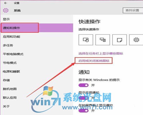 2、然后,我们就可以在系统功能设置页面中,点击选择“通知和操作”选项,在选项页面右端点击选择“启用或关闭系统图标”菜单选项。