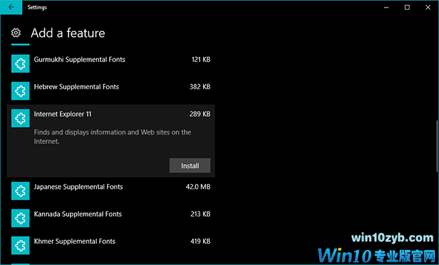 3.单击名称,然后单击“安装”将IE 11添加为Win10中的可选功能。