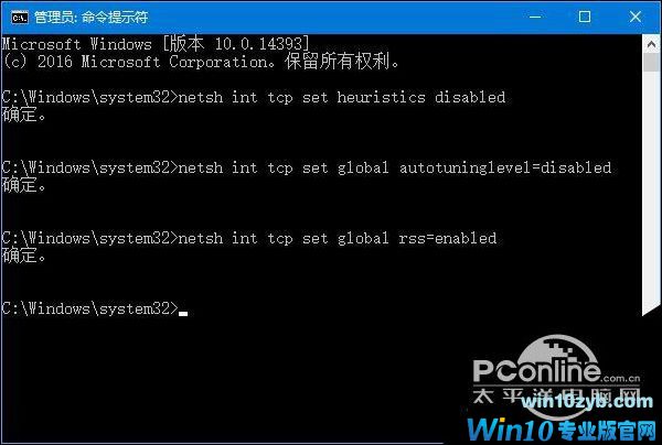 2、打开命令提示符后,键入:netsh int tcp set heuristics disabled 按下回车键执行命令;