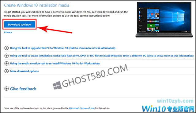 1.单击上面的链接将带您到创建Windows 10安装媒体的起始页面。一旦出现,请忽略第一个框,向下滚动页面,然后单击“立即下载工具”按钮。