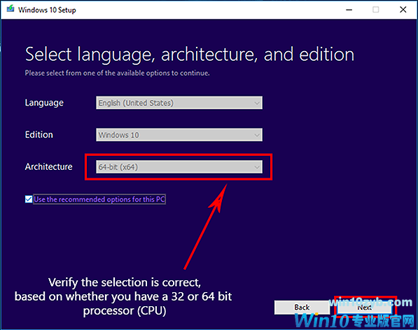5.验证正确的语言,操作系统版本(Windows 10)以及是否要安装32位或64位版本。 如果您拥有支持64位的硬件,那么我们建议您始终选择64位,因为32位版本缺少64位版本的许多功能,并且不支持超过4GB的系统内存。 然后,单击下一步。