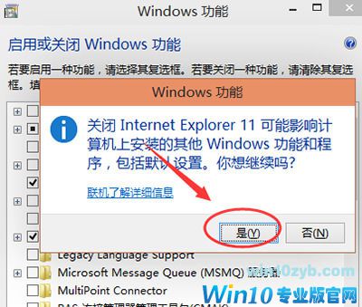 5、去掉Inetrnet Explorer 11浏览器前面的勾勾时,弹出提示关闭Inetrnet Explorer 11可能会影响计算机上安装的其他Windows功能和程序对话框,点击是,如下图所示。